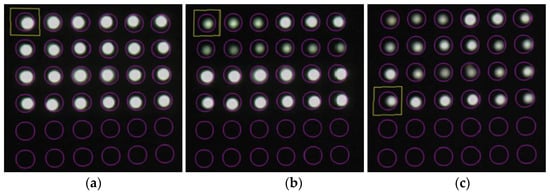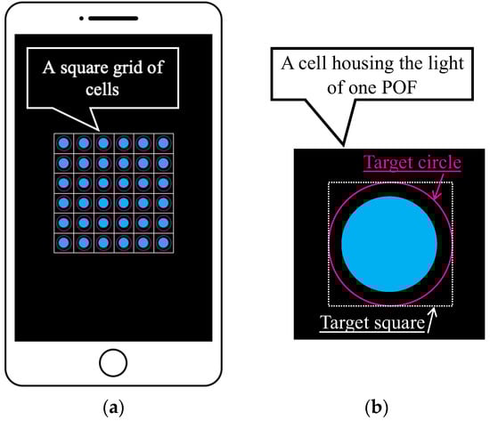 As shown in Figure 7a, the light captured by multiple POF sensors is accurately distributed within individual cells in a square grid of cells. In this scenario, a target square inscribed within a user-defined target circle (indicated by the pink circle in Figure 7b) in each cell was first established as the square area representing one POF sensor. We assumed that the total number of pixels within this square is represented by n. Given that the fundamental data of the three primary light colors held by the i-th pixel are Ri (red), Gi (green), and Bi (blue), the average values (R, G, and B) within the target square can be computed as follows:
