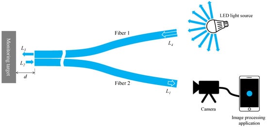 The fundamental capability of the R2 sensor to detect color changes resulting from metal corrosion was visually confirmed. However, the light data collected by the POF sensor had to be processed digitally for more comprehensive tracking of the occurrence and progression of corrosion. Therefore, a new application software [34], hereinafter referred to as the “image processing application”, that utilized the image processing functions of a smartphone was developed. The image processing application could capture the light obtained through the POF and analyze the data using either the integrated camera of the smartphone or an external camera. This approach allowed precise monitoring suitable for engineering applications in various scenarios, including tasks such as color identification, displacement measurement, tilt measurement, and moisture detection on the ground [34]. The basic features of the system are illustrated in Figure 7.
