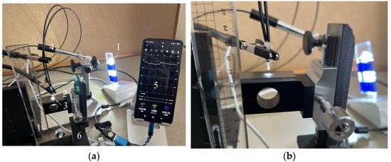 Experimental apparatus used to examine the optimal distance from the R2 sensor to a steel plate: (a) Experimental layout: (1) Light-emitting diode (LED) light. (2) R2 sensor. (3) Steel plate. (4) USB camera (AS ONE Corporation, USB Digital Microscope SDM200). (5) Smartphone with the graphic application software. (6) Three-dimensional stage; (b) Enhanced view of the R2 sensor and the steel plate.
