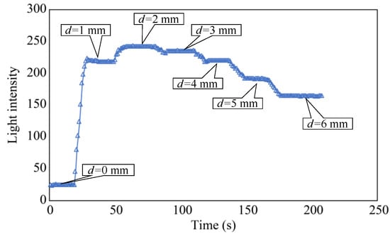 In the initial phase of the plate-lowering experiment, the separation distance, d, was set to zero and maintained for approximately 20 s. Subsequently, d was incrementally increased by 1 mm every 10 s and maintained for approximately 20 s. When d reached 6 mm, it was maintained at this value for approximately 30 s to complete the experiment. Figure 10 shows the light intensity L of the R2 sensor at this point, revealing that L was significantly higher within the range of d = 2–3 mm. Based on this trend, the standard separation distance, d, was determined to be 3 mm. This decision considered the convenience of the fixture used to create a more advanced sensor for subsequent experiments.