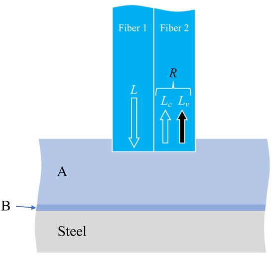 The factors considered when attempting to observe corrosion on the surface of a steel plate through two adhesive layers, as illustrated in Figure 12, were explained subsequently. The light was reflected or scattered from the boundary surfaces between adhesive layers A and B, between adhesive B and the steel plate (steel), and from the actual surface of the steel material. Consequently, the observed light, R, in Fiber 2 was expressed as the sum of two components.