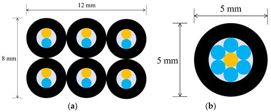 The secondary checkpoint involved closely monitoring the progression of corrosion in the vicinity of each of the sensor installation points within the steel plate. To realize this, employing the previously described R2 sensor would entail utilizing two 1 mm-diameter POF cables within one sensor unit. If the pipes accommodating these POF cables had an inner diameter of 2 mm and an outer diameter of 4 mm, observing 6 locations would necessitate an 8 mm by 12 mm rectangular area (Figure 13a). In this case, the actual observation points would be spaced apart by a few millimeters. By implementing the concept of sharing a single POF illuminating multiple observation points, the arrangement depicted in Figure 13b enabled densely positioning six observation POFs within a circle approximately 5 mm in diameter (corresponding to the outer pipe diameter holding the POFs). This configuration facilitated the acquisition of detailed insights into corrosion progression at multiple contiguous locations in front of a single sensor unit.