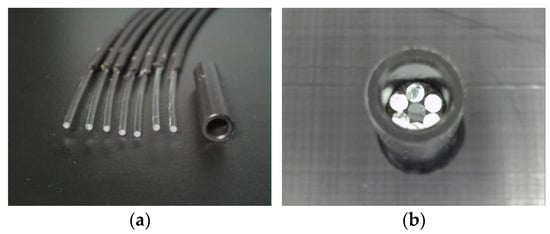 Structure of the R7 sensor: (a) Seven POF cables with a length of 2.5 m and a plastic pipe; (b) Assembled form before injecting adhesive A.