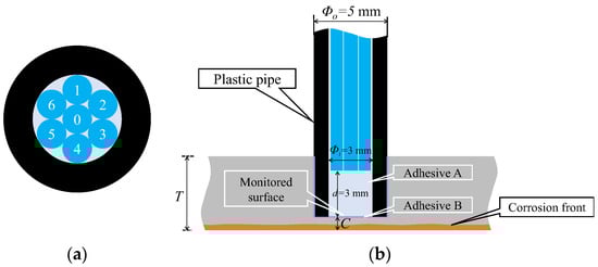 Figure 15 shows a detailed perspective of the R7 sensor. The seven POFs were tightly fitted within a plastic pipe with a 3 mm inner diameter, facilitated by the 1 mm diameter of each POF. The centrally positioned Fiber 0 was the light emitter, whereas the surrounding six fibers (Fibers 1–6) captured the light that was reflected and scattered from marginally varied points ahead of the sensor. Using a small quantity of general-purpose instant adhesive B, the R7 sensor was affixed into a 5 mm-diameter hole on the upper surface of a steel plate with thickness T. The R7 sensor facilitated the monitoring of a 3 mm diameter observation area (corresponding to a corrosion depth labeled as C, measured from the underside) to track the state and progression of the upward-propagating corrosion area initiated from the underside of the steel plate.