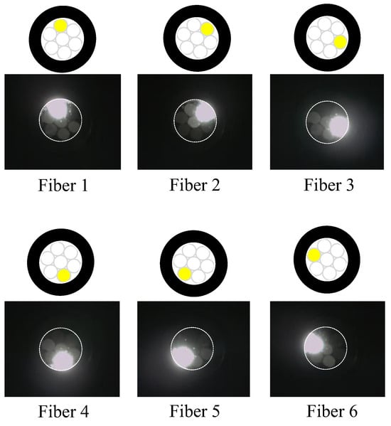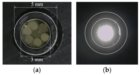 Figure 16 shows a frontal close-up of the R7 sensor (Figure 16a) and the state of the R7 sensor when the light was applied only to Fiber 0 (Figure 16b).