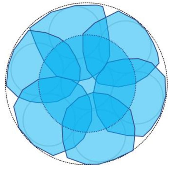 We considered a reverse approach in this context. When the light from Fiber 0 reached Area 0 on the adhesive surface A, some light was reflected or scattered. Among this reflected or scattered light, only the portion directed toward Fiber 1 and overlapping with Area 1 enters Fiber 1. In essence, Area 1 served as both the region where light entered Fiber 1 when it was irradiated and the region from which light in the surrounding areas entered Fiber 1 after being scattered or reflected. Thus, it became the “observed region perceived by Fiber 1”. Similarly, the respective observation areas of Fibers 2–6 could also be defined, as illustrated in Figure 18. This figure illustrates that the light emitted from Fiber 0 at the center could be employed to monitor the entire three-millimeter-diameter observation surface, with some overlap between the observation areas of Fibers 1–6.