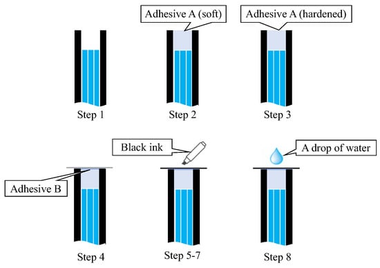The 3 mm space from the tip of the seven POFs within the holder pipe, having an inner diameter of 3 mm, required protection from water intrusion during the measurement period. To achieve this, adhesive A, capable of rapid solidification through UV irradiation, was employed to fill this space. Upon application of the adhesive into the designated area, any potential presence of air bubbles within the adhesive might adversely affect light-based measurements. Hence, if bubbles were found, they were cautiously removed using an ultrafine needle before UV light exposure for solidification. Subsequently, after assembling the sensor body, swift fixation onto the hole on the steel plate surface was essential; hence, adhesive B (Product ID #04612 produced by KONISHI BOND), known for instantaneous solidification, was utilized.