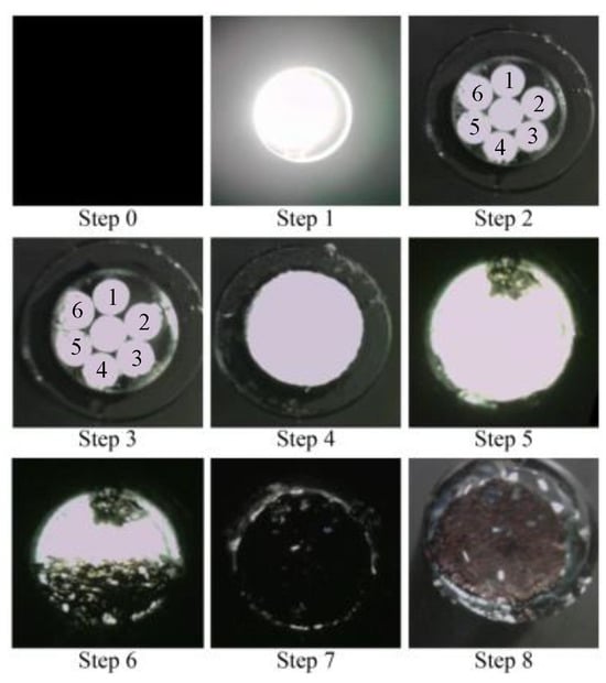 A simple experiment was conducted in a dark room to verify the functionality of the proposed R7 sensor before conducting the actual steel plate corrosion experiment. This experiment involved nine sequential steps (Steps 0–8) to assess the performance of the R7 sensor at each stage, as shown in Figure 19.