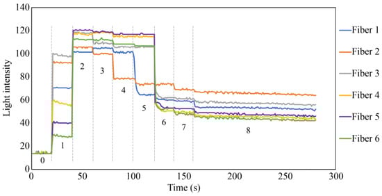 - Step 0: Initially, the R7 sensor was incomplete, with only seven POFs inserted into the plastic pipe. The measurement commenced with no obstruction in front of the sensor, and this condition was maintained for approximately 20 s.
