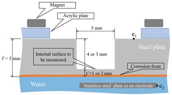 Building on prior discussions, a sensor was designed to monitor the upward propagation of the corrosion phenomena beneath a steel plate. The design adhered to the following fundamental conditions: