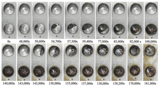 Based on these visual observations, the times required to identify the initial corroded area in boreholes 1C and 2C with corrosion thicknesses of 1 and 2 mm were 48,000 and 140,000 s, respectively, indicating different corrosion thicknesses. Subsequently, the time taken for the corrosion zone to encompass the entire area, following its initial observation at the base of the borehole, was 52,000 and 18,200 s at 1C and 2C, respectively. These findings confirmed the fundamental corrosion initiation and propagation patterns observed in this experiment. However, the corrosion rate might not be uniformly distributed across the entire steel plate.