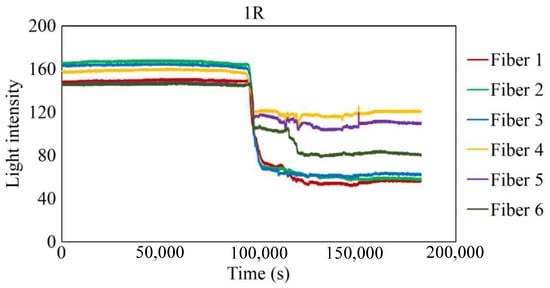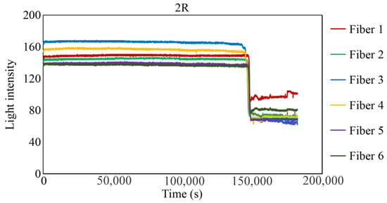 The behavior recorded by the R7 sensor in observation hole 1R is shown in Figure 27. Immediately after the commencement of the experiment, a consistent level of light was captured by Fibers 1–6. The light emitted from Fiber 0 penetrated the two adhesive layers and was reflected from the steel surface at the base of the observation hole 1R, providing stable measurements. Subsequently, within a specific timeframe preceding 100,000 s, the light intensities in Fibers 1–6 exhibited diminishing trends, albeit to varying degrees, and then remained somewhat unstable until approximately 150,000 s. Throughout this interval, the light intensities of Fibers 1 and 6 were unstable, particularly that of Fiber 6. This period is presumably influenced by corrosion byproducts, indicated by a blend of black, brown, and other hues, and possibly water, generated by the ongoing corrosion process. Moreover, the light intensities generally stabilized beyond 150,000 s, signifying that the conditions in front of Fibers 1–6 became steady and independent of the progression of corrosion.