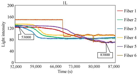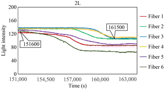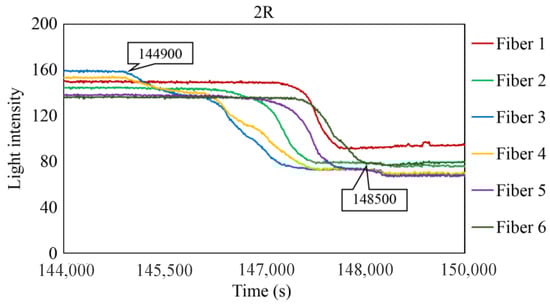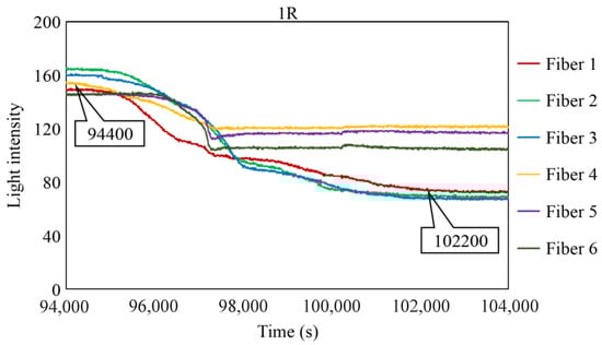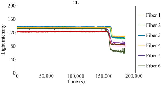 Figure 29, Figure 30 and Figure 31 show the light intensity results recorded in additional observation holes, namely, 1L, 2R, and 2L. In 1L, the light intensity in certain fibers decreased considerably earlier than in 1R despite having the same corrosion thickness. Subsequently, the light intensity exhibited irregular fluctuations during the simultaneous decrease and in the subsequent period, where it fluctuated but remained stable. This suggests that the generation of corrosion products near observation hole 1L was highly intricate. The irregular light intensity fluctuations persisted until just before the experiment concluded. In boreholes 2R and 2L, where the corrosion thickness measured 2 mm, a simultaneous decrease in light intensity occurred around 150,000 s, followed by stabilization. Figure 32, Figure 33 and Figure 34 provide magnified images of the period during which the simultaneous light intensity reduction occurred in 1L, 2R, and 2L. These boreholes exhibited corrosion areas appearing at marginally different times in various locations, indicating the recording of the corrosion development process.