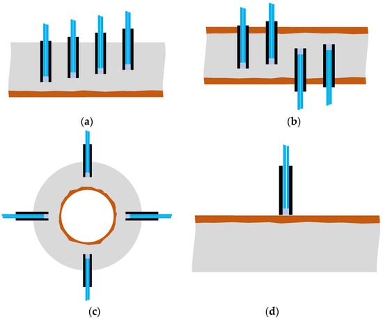 In this study, we focused on the phenomenon in which light reflected on the surface of an object could be captured to obtain insight into the changes in the surface state of an object. A POF sensor was used to identify the expansion of the corrosion area originating from one side of a steel plate and progressing in the opposite direction. The experiment utilized a specific configuration (R7 sensor) in which the sensor was composed of one light-supplying POF and six POFs for light observation, thereby allowing detailed monitoring of the evolving corrosion zone. However, in practical applications, a sensor with seven POFs need not be installed at each corrosion-checking location; the simpler R2 sensor equipped with two POF cables will be sufficient. For a more detailed determination of the corrosion zone depth, R2 sensors could be installed at various locations, as shown in Figure 37a. Alternatively, if corrosion is expected to occur and propagate from both sides of a steel plate, R2 sensors could be positioned on both sides, as illustrated in Figure 37b. The arrangement shown in Figure 37c could be used to monitor a corrosion zone expanding outward from the interior of a thick-walled circular pipe, provided the sensor installation did not disturb structural safety. This paper introduces a novel POF sensor designed initially for monitoring corrosion progression on a metal plate; however, it is also applicable for detecting surface corrosion. For this application, the adhesive would be selectively applied solely to the sensor’s front surface to block water penetration, consequently averting corrosion. Thus, as depicted in Figure 37d, the sensor should be used adhesive-free, ensuring a slight gap existed between the sensor’s front surface and the targeted monitoring point.