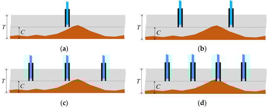 Considering scenarios where corrosion thickness or rates vary across locations and the goal was to detect the point when the corrosion depth reached C at the most advanced area of the plate (thickness T), deploying only one sensor might lead to a high probability of failure to detect the corrosion front, as depicted in Figure 38a. Even with an increase in the number of sensors to 2 or 3 (Figure 38b,c), there remained a possibility of missing the corrosion front. Increasing the number of sensors, regardless of cost or time, naturally enhanced the chance of one sensor detecting the corrosion zone front (Figure 38d). However, solely increasing the number of sensors to elevate the probability of detecting the corrosion zone or identifying corrosion rates raised multifaceted concerns. These included considerations of budgetary constraints for monitoring and structural safety implications due to the puncturing procedures required for installing the sensors on the target structure. To address these challenges, strategies like minimizing sensor diameter to reduce costs and mitigating structural safety impacts during installation were under contemplation for future investigation.