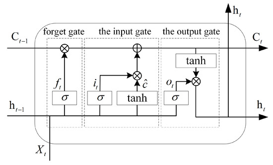However, the simple RNN network structure often suffers from the problem of gradient dispersion and gradient explosion during the training process [22], which makes the network parameters fail to converge for a long time during the training process. The author proposed the LSTM [23], which solves this problem to a certain extent. The structure of the LSTM NN is shown in Figure 4, which introduces the concept of gate in the traditional RNN to control the opening of an information flow in the network cycle by simulating the characteristics of human memory to achieve the goal of local key information filtering and long-time-span feature synthesis. In (6), the relevant definitions of Figure 4 are explained. The three gates in the LSTM are the forget gate , the input gate , and the output gate . All three gates are composed of cells controlled by the current input and the previous time output . The forget gate controls the opening of the historical state into the current state , the input gate controls the opening of and into , and the output gate controls the opening of into the current output .