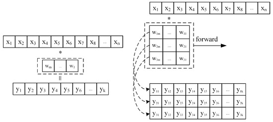 The calculation process shows that each result of the convolution calculation can be viewed as the inner product of vector and vector . Similarly, when multiple convolution kernels are convolved with the input sequence at the same time, multiple output sequences can be obtained. For example, if the kernel size is 3, the operation process is shown in Figure 6. It can be seen that the result obtained from each sliding calculation of the convolution kernel is actually the result of multiplying the weight matrix and the vector formed by w.