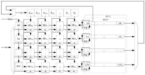 The result cache array consists of two sets of 32 channels of RAM with the same structure, and . When one of the is used as the input source for the systolic operation, the other is used as the result cache. Of course, both of them support both single-channel row outputs and multi-channel column outputs, where the multi-channel column output function is used to realize the last convolutional layer operation result as the input of LSTM and the reuse of matrix vector multiplication results.