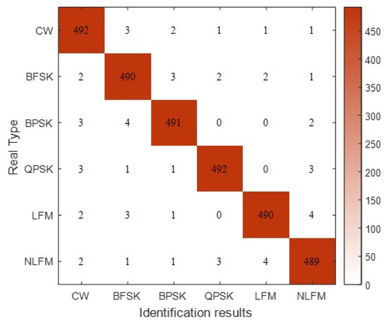 We used the the Pytorch deep learning framework to train the constructed 1D-CNN-LSTM model. The normalized recognition accuracy and loss values of the algorithm model for the training and test sets during 500 iterations of the training set are shown in Figure 16. At the end of the training, the recognition accuracy of the model for the training and test sets reached 100% and 97.27%, respectively. To demonstrate the identification of the various categories, we present the confusion matrix in Figure 17. We found that between LFM and NLFM, BPSK and QPSK were more difficult to identify. Other types were better identified, and the identification results were relatively evenly distributed.