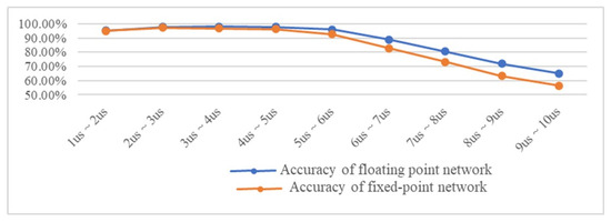 The trained algorithm model was coded and the parameters quantized, and then deployed on the computational acceleration platform designed in this paper for testing. For the training and test sets constructed in this paper, the processing performance of a total of 18,000 signals was tested with the Pytorch deep learning framework on the CPU and the FPGA computing acceleration platform designed in this paper as acceleration devices to run the same models. The comparison of recognition accuracy is shown in Table 3.