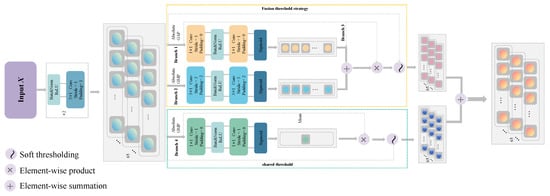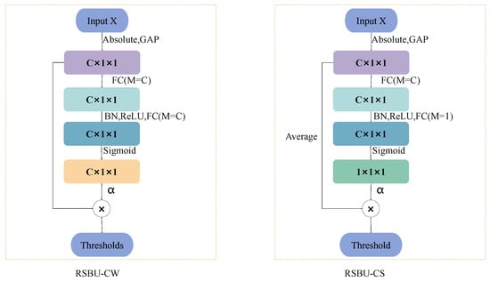 The RSBU, as a core component of the DRSN, is tasked with obtaining one or a set of soft thresholds. The only difference between the DRSN with channelwise thresholds (DRSN-CW) and the DRSN with channel-shared thresholds (DRSN-CS) lies in how the is computed within the Residual Shrinkage Block (RSBU), as shown in Figure 2. In the DRSN-CW, the RSBU calculates a separate threshold for each channel (while the DRSN-CS uses a channel-shared threshold), enabling adaptive thresholding. To select the most-significant features in the image, reduce the data dimensionality, and enhance the model’s interpretability, a soft thresholding function is used to accomplish these tasks. The process can be represented by Equation (6).