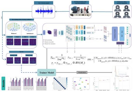 Mechanical rotating components play a pivotal role in various domains of modern industry, encompassing engines, motors, turbines, and more [1,2,3]. Among these components, bearings, serving as the essential supporting elements of mechanical rotating parts, bear the crucial functions of load transmission and friction mitigation. However, when operating for extended periods under complex conditions, mechanical rotating components often experience an array of failures, such as bearing Rolling element wear, loose cages, and inner Ring fracture, among other issues [4,5]. These failures not only lead to interruptions in industrial production, but also pose the risk of severe consequences, including equipment damage, accidents, and even personnel injuries. Therefore, accurate and timely monitoring and diagnosis are critical in ensuring equipment reliability and maintaining production efficiency [6].