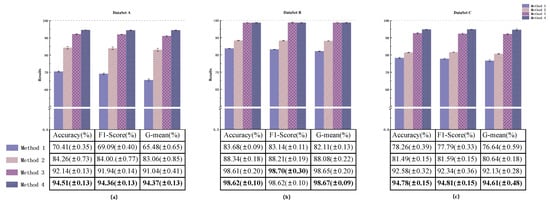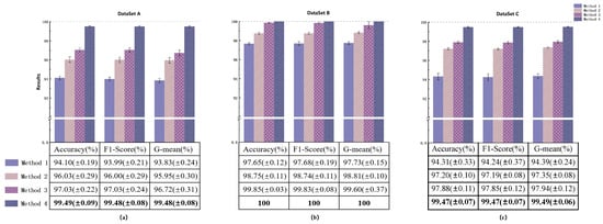 In order to verify the performance of the DSADRSViT-IIRL on small and imbalanced Datasets, we conducted ablation experiments on four Datasets, A, B, C, and D. The DSADRSViT-IIRL (Method 4) was compared with other models, namely ViT-CE (Method 1, without the DSA-DRSB and IIRL), ViT-IIRL (Method 2, without the DSA-DRSB), and DSADRSViT-CB Loss (Method 3, without the IIRL). After 100 iterations, the diagnostic diagram of the model is shown in Figure 6. When dealing with the Balanced Dataset, as shown in Figure 6a, by comparing Method 1 and Method 2, in the absence of the DSA-DRSB module, which has been introduced to address issues related to small Sample sizes, we observed that the CE treats each of the data in the same way and cannot give timely attention to the difficult Samples hidden between the Samples, and the anti-interference ability is not satisfactory, which leads to the model ignoring a few difficult Samples; thus, the overfitting phenomenon is found. In contrast, for Method 2, continuously injecting new gradients into the model through the technique of online mining of difficult Samples further suppresses the occurrence of the model overfitting. This results in the Accuracy, F1-Score, and G-mean reaching 96.03%, 96.00%, and 95.95%, respectively, which is a significant improvement over Method 1. Hence, in the absence of deep feature extraction, the IIRL undoubtedly provides a reliable method for solving the problem of Balanced Datasets.