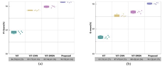 The ablation experiment depicted in Figure 6 corroborates the rationale for incorporating convolutional layers into the Vision Transformer (ViT) architecture by comparing Method 4 to Method 2. However, it does not elucidate the extent to which this innovation surpasses the traditional CNN and the original DRSN. Moreover, to more effectively demonstrate the modeling capability and robustness of the DSA-DRSB on small Datasets, we conducted ablation experiments under the small and extremely imbalanced Dataset D with mixed loads, and the results are shown in Figure 7a,b, which show that ViT and ViT-CNN did not manage to achieve satisfactory results on severely imbalanced Datasets with mixed loads, with the F1-Score only reaching 84.59% and 89.17%. In contrast, ViT-DRSN introduces the DRSN after Embedding, which constrains the input feature vector solely through the utilization of Branch 1 (Average Pooling and channel thresholding). This removal of the non-critical parts of the signal enhances the model’s focus on vectors with crucial features, leading to strong performance on complex data. However, its F1-Score and G-mean never exceed 90%. In contrast, the proposed method achieves diagnostic results with both the F1-Score and G-mean surpassing 90% for the first time, reaching 90.95% and 90.12%, respectively. This further demonstrates that the method can effectively extract key discriminative features hidden in the signal, even in complex mixed loads, through the fusion thresholding and shared thresholding strategies, showcasing excellent modeling and anti-interference capabilities.