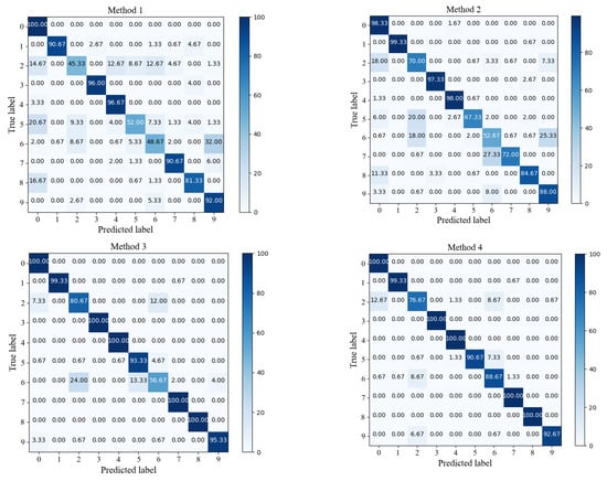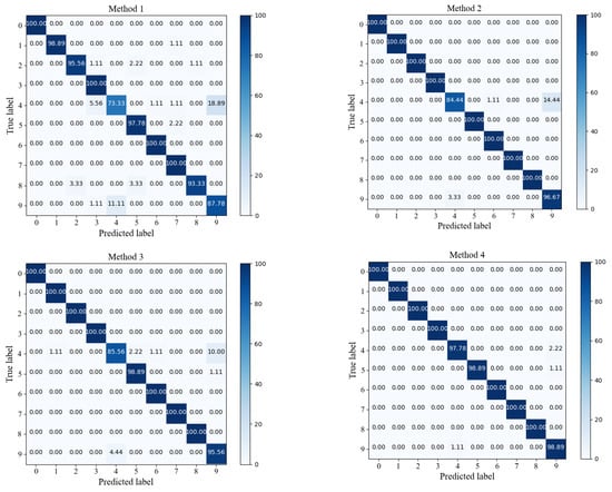 To provide a clearer view of each model’s diagnostic results for each Class in the extremely imbalanced Dataset C, the confusion matrix visualizations for the first run of each model were generated. In these visualizations, the row labels represent the diagnostic results, while the column labels represent the true labels for fault Classes. As shown in Figure 8, the overall accuracies for the four models are as follows: 94.31% for Method 1, 97.20% for Method 2, 97.88% for Method 3, and 99.47% for Method 4. It can be observed that Method 1 did not achieve the expected performance for label 4. Nevertheless, Method 2, when enhanced with the IIRL, conducts additional in-depth feature extraction on challenging Samples belonging to this category, mitigating the CE’s uniform treatment of all Samples. As a result, the diagnostic Accuracy increases from 74.44% to 85.56%. Furthermore, with the addition of the DSA-DRSB, which has strong capabilities for modeling fine-grained features, the model’s diagnostic results improved from 85.56% to 97.78%. The main reason for this improvement is that the DSA-DRSB models local details of the input Samples, filters out irrelevant features, mitigates training biases, and makes the decision boundaries between Classes clearer, thereby enhancing the model’s Classification capabilities for each type of data.