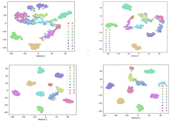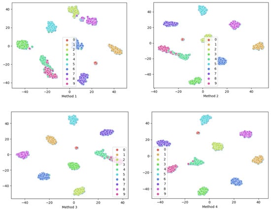 In addition to the previously mentioned visualization techniques involving confusion matrices, t-Distributed Stochastic Neighbor Embedding (t-SNE) is another commonly employed method for visualization. Continuing to use Dataset C as an example, the data were subjected to feature dimensionality reduction to obtain visualization results. As shown in Figure 9, in Method 1, there is significant overlap between different faults, such as faults 4 and 9, which lack clear decision boundaries. Similar situations are observed in Method 2 and Method 3, indicating insufficient fault-detection capabilities. However, the proposed methods are able to completely distinguish each fault Class (with only four Samples unable to be distinguished). There are clear distribution boundaries, enhancing the separability between different Classes and improving the model’s fault diagnostic capabilities.