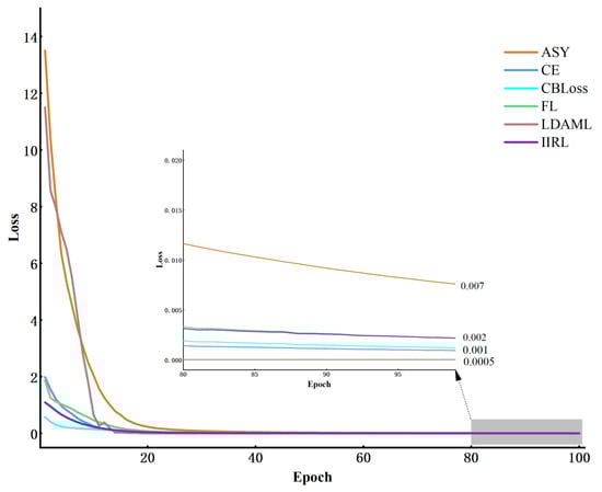 To explore the effectiveness of the IIRL even further, we compared it to five currently available methods. This includes the CE, which achieves excellent results on Balanced Datasets, and four techniques that perform well on long-tailed Datasets: Class Balanced (CB), Asymmetric Loss (ASY) [37], LDAM Loss (LDAML), and Focal Loss (FL) methods, all with their best parameter settings as specified in the respective papers. The experiments were performed on Dataset A and Dataset C, and the diagnostic results are presented in Table 4. Whether the performance of the CE can be fully realized in the Balanced Dataset depends, to some extent, on the extent to which the feature vectors are captured. Undeniably, the performance of the CE with the DSA-DRSB is significantly better than other methods, proving once again that the DSA-DRSB with threshold fusion and shared thresholding has the ability to capture discriminative features in small Samples and imbalanced Datasets. The performance of the CB Loss inside the Balanced Dataset decreased compared to the CE [38], both in terms of the F1-Score and G-mean advantages. Additionally, the convergence curves for each Loss function on Dataset C are shown in Figure 10, with the diagnostic performance jointly reflected in Table 4 and Figure 10. It is evident that, when facing the challenges of long-tailed data, all methods except the proposed ones are at risk of overfitting. For instance, the LDAML converges to a Loss value around 0.0005, but as shown in Table 4, its F1-Score and G-mean on Dataset C are only 94.35% and 93.95%, respectively, which is disappointing compared to the proposed methods’ F1-Score and G-mean of 99.47% and 99.50%. Additionally, inspection of Figure 10 reveals that the advocated method consistently preserves convergence smoothness throughout the model training phase, without exhibiting pronounced oscillations akin to those observed in functions such as the LDAML and FL. Furthermore, although the CB Loss converges more uniformly than the IIRL, its F1-Score and G-mean metrics on the severely imbalanced Dataset C are merely 95.88% and 95.65%, respectively, as indicated in Table 4. This represents a considerable discrepancy from the IIRL’s respective scores of 99.47% and 99.50%, owing to the IIRL’s augmentation of the total Loss with Continuous incorporation of Loss about the challenging Samples within the Class. The persistent injection of this segment of Loss into the aggregate prevents the emergence of overfitting and facilitates stable convergence by iteratively grasping the elusive, highly discriminative features. This suggests that the IIRL holds promise in handling long-tailed distribution data.