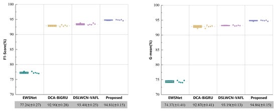 To validate the superiority of the intelligent fault diagnosis method proposed in this paper, we performed comparative experiments with other recent models, such as EWSNet [39], DCA-BiGRU [34], and DSLWCN-VAFL [35]. To maintain a standard of impartiality, it is crucial to emphasize that the hyperparameters associated with the models discussed are harmonized with those adopted in the methodology presented within this paper. Figure 15 displays the results of comparing imbalanced Datasets at various scales. In the case of severe Class imbalance, EWSNet fails to achieve satisfactory results. The relatively better performance of the DCA-BiGRU and DSLWCN-VAFL depends on the successful training of these two models, which involve complex recurrent or convolutional architectures to handle long-term dependencies effectively. Additionally, as they aim to extract deeper features from limited Samples, they often face a shift in the training direction accompanied by the stacking of Network layers. In contrast, the Proposed method can extract deep Sample features with a limited number of Network layers, indicating a promising application scenario.