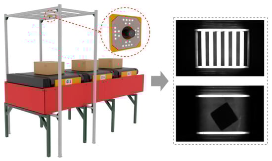 As depicted in Figure 2, trolleys 1 to 3 are mounted on the running track and navigate along the track’s axis (left and right). Chutes 1 to 6 are strategically positioned on either side of the running track. Parcels are placed on the trolleys’ surfaces, and as the trolleys advance to the designated drop-off positions along the track, the parcels descend into the corresponding chutes, aligned with the trolley’s trajectory (up and down), thereby concluding the sorting process. Owing to the positional variations in parcels on the sorting trolleys (as demonstrated in Figure 1, Parcel 1 to Parcel 3), the precise drop-off location varies for each trolley. The drop-off location is ascertained based on the parcel’s relative position on the trolley. This study introduces a novel algorithm for motion-based parcel position correction, integrating traditional and AI vision technologies. The algorithm precisely computes the relative positioning of parcels on each trolley, establishing the foundation for determining the drop-off location for each trolley, consequently enhancing the precision of parcel sorting in intelligent logistics systems. To realize this objective, the paper delineates the comprehensive structure for image acquisition, as exemplified in Figure 3.