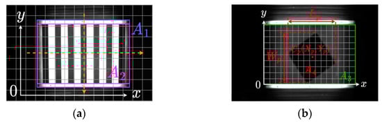 Through the image acquisition structure in Section 3.1, we can obtain multiple sets of images containing information about the trolley’s position. Selecting an image containing trolley number one serves as the basis for traditional vision to partition the trolley detection area, as shown in Figure 4a. The original image is divided into small regions, and the average grayscale value of all pixels in each region is taken as the grayscale value of that region. The coordinate of the region’s center point is considered as the coordinate of that region. Column scanning and row scanning are performed on the middle part of the image, counting the coordinate information of all small regions whose grayscale values exceed the set threshold. From these, the maximum and minimum values of x or y are, respectively, selected to obtain the relative coordinate information of region within the image area. To reduce interference from the edges of the trolley, region is cropped from the image and further divided into small regions. Column scanning is performed on the middle of region , counting the coordinate information of all small regions whose grayscale values are below the set threshold. From these, the maximum and minimum values of y are selected to obtain the relative coordinate information of region within area . Finally, region , cropped from region , is the detected area for the trolley.