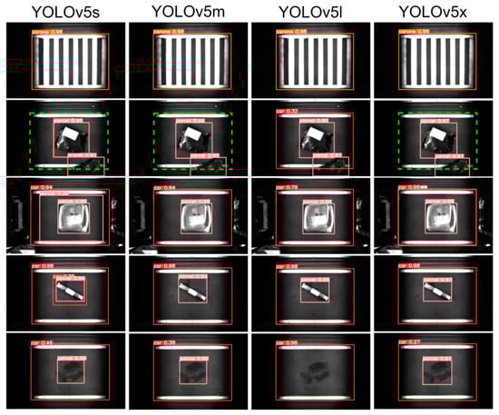 Given YOLOv5′s outstanding performance in inference speed and recognition accuracy among one-stage algorithms, this study refines YOLOv5 to develop a parcel positioning algorithm tailored for actual intelligent logistics sorting systems. We selected four commonly used variants of YOLOv5 for experiments comparing the detection accuracy of trolleys and packages. Figure 5 and Table 1 present the experimental results.