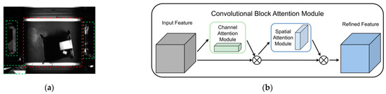 In real logistics centers, there is often a significant amount of clutter around the conveyor belt. Therefore, we aim for the model to focus more on the information related to the trolley and the package in both the training and inference stages (as shown in the red area of Figure 6a), while reducing interference from irrelevant information (such as the green area in Figure 6a). To enhance the model’s perceptual and generalization abilities, we introduce the Convolutional Block Attention Mechanism (CBAM) [20]. CBAM is a simple yet effective attention module in feedforward convolutional neural networks, combining both channel attention and spatial attention mechanisms applied to the convolutional block, as illustrated in Figure 6b.