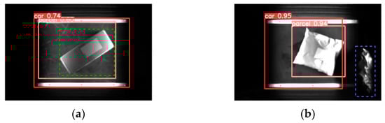 While the CIoU loss function [21] employed in YOLOv5 progressively approximates the width-to-height ratio of the actual bounding box, there are instances where the predicted box may not fully encompass the package, as depicted in Figure 8a. Furthermore, the model encounters difficulties in processing complex samples (illustrated in Figure 8b), resulting in occasional omissions of packages and compromised quality of the predicted bounding box for the trolley.