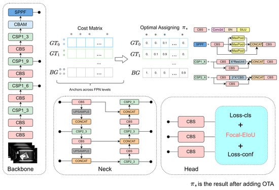 In Equation (5), denotes the network parameters; represents the balance coefficient; and and signify the predicted class score and the bounding box , respectively. and stand for the ground-truth class and the bounding box . Additionally, and denote the cross-entropy loss and IoU [26] loss, which can be replaced by Focal Loss [27] and GIoU [28] loss. Finally, represents the background class.