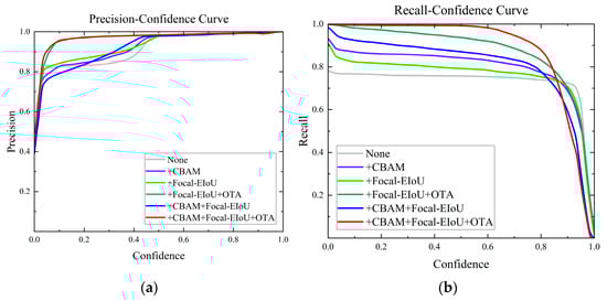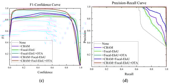 In actual logistics centers, numerous unpredictable elements, like blurred images and partially obscured parcels, can result in detection outcomes with diverse confidence levels. The objective is for the model to fulfill actual detection accuracy demands across varying confidence levels. The efficacy of various enhancement strategies at distinct confidence levels was examined and is depicted in Figure 9. As depicted in Figure 10a, OTA markedly enhances the model’s precision at lower confidence levels. Figure 10b illustrates that all proposed enhancement strategies bolster the model’s recall in the mid-to-low-confidence spectrum. Significantly, in the confidence range around 0.8, CFO-YOLOv5 demonstrates a substantial enhancement in F1 score relative to YOLOv5, as shown in Figure 10c. Figure 10d reveals that all proposed enhancement strategies lead to a considerable augmentation in the model’s mAP value.