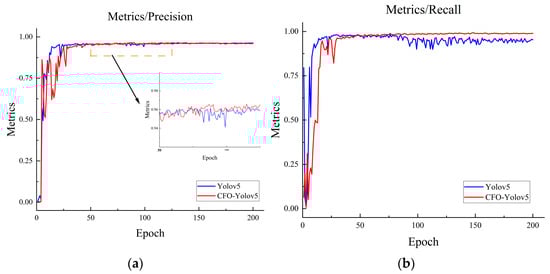 Additionally, the training process was meticulously recorded both before and after the enhancement of the YOLOv5 network. As illustrated in Figure 11, relative to the pre-enhancement YOLOv5 network, the precision and recall curves of the enhanced network demonstrate more uniform and expedited convergence throughout the training process. Notably, both curves achieve convergence approximately at the 100-epoch mark.
