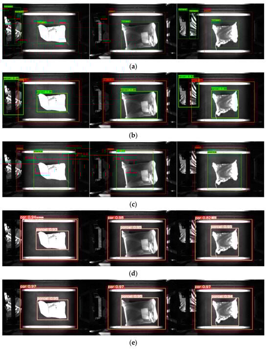 In this research, various prevalent models in the object detection domain were chosen to compare their performance against CFO-YOLOv5, using the same test set. Table 3 showcases the performance metrics of each model, including F1, precision (P), recall (R), and frames per second (FPS), all garnered under identical experimental conditions. According to Table 3, SSD [29] exhibits the highest inference speed, whereas Faster RCNN [30] demonstrates the lowest. CFO-YOLOv5, as proposed, maintains a moderate inference speed but excels in regard to the F1 score compared to the other models. Furthermore, the study randomly selected and compared labeling outcomes of trolleys and parcels by the models in the test set, as depicted in Figure 12. Figure 12a,b reveal that both the Faster RCNN and SSD erroneously identify extraneous objects outside the trolley as parcels and display limited accuracy in trolley localization. Figure 12c indicates that while RetinaNet [27] avoided false positives for irrelevant objects outside the trolley, its accuracy in localizing trolleys and parcels is comparatively limited. Figure 12d illustrates that the original YOLOv5 incorrectly identifies a trolley as a parcel. In contrast, CFO-YOLOv5 demonstrates a relatively superior performance in this test, as shown in Figure 12e.