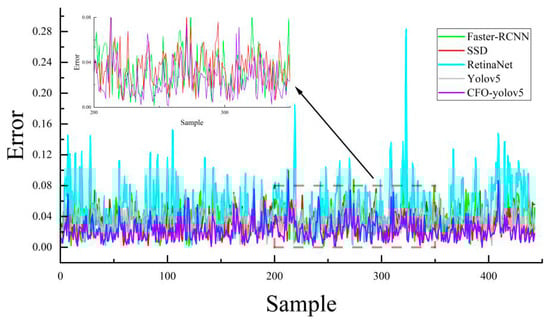 We selected 443 single-package images from the test set as the experimental samples to assess the model’s package localization errors. The experiment involved normalizing the target localization coordinates for different models, and the results are presented in Figure 13 and Table 5.