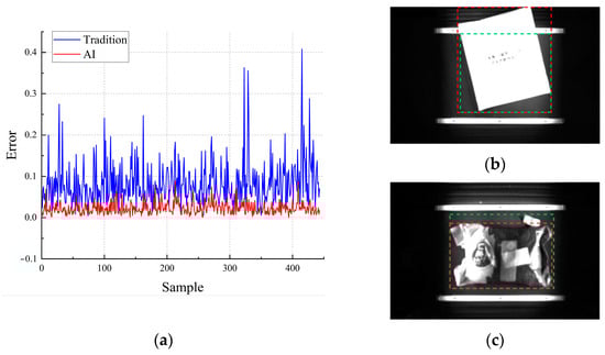 Table 6 clearly demonstrates that, as the demand for higher accuracy in identifying trolleys and packages increases, the model encounters challenges with missed package detections. Despite maintaining high precision in recognition, this study incorporated traditional vision as an auxiliary method for package positioning. To ascertain the effectiveness of integrating traditional and AI vision for express package localization, single-package precision experiments were conducted using traditional vision. CFO-YOLOv5 was employed as the benchmark for AI vision, and the single-package image dataset from Section 4.7 was used as the comprehensive experimental sample. The resulting error data were then normalized for analysis. As shown in Figure 14a, traditional vision exhibits slightly less favorable performance in terms of positioning error and fluctuation. This outcome is influenced by the intrinsic relationship between package position and shape, as illustrated in Figure 14b,c. This integration strategy highlights the strengths and limitations of both traditional and AI vision, providing insights into optimizing package localization in complex logistic environments.