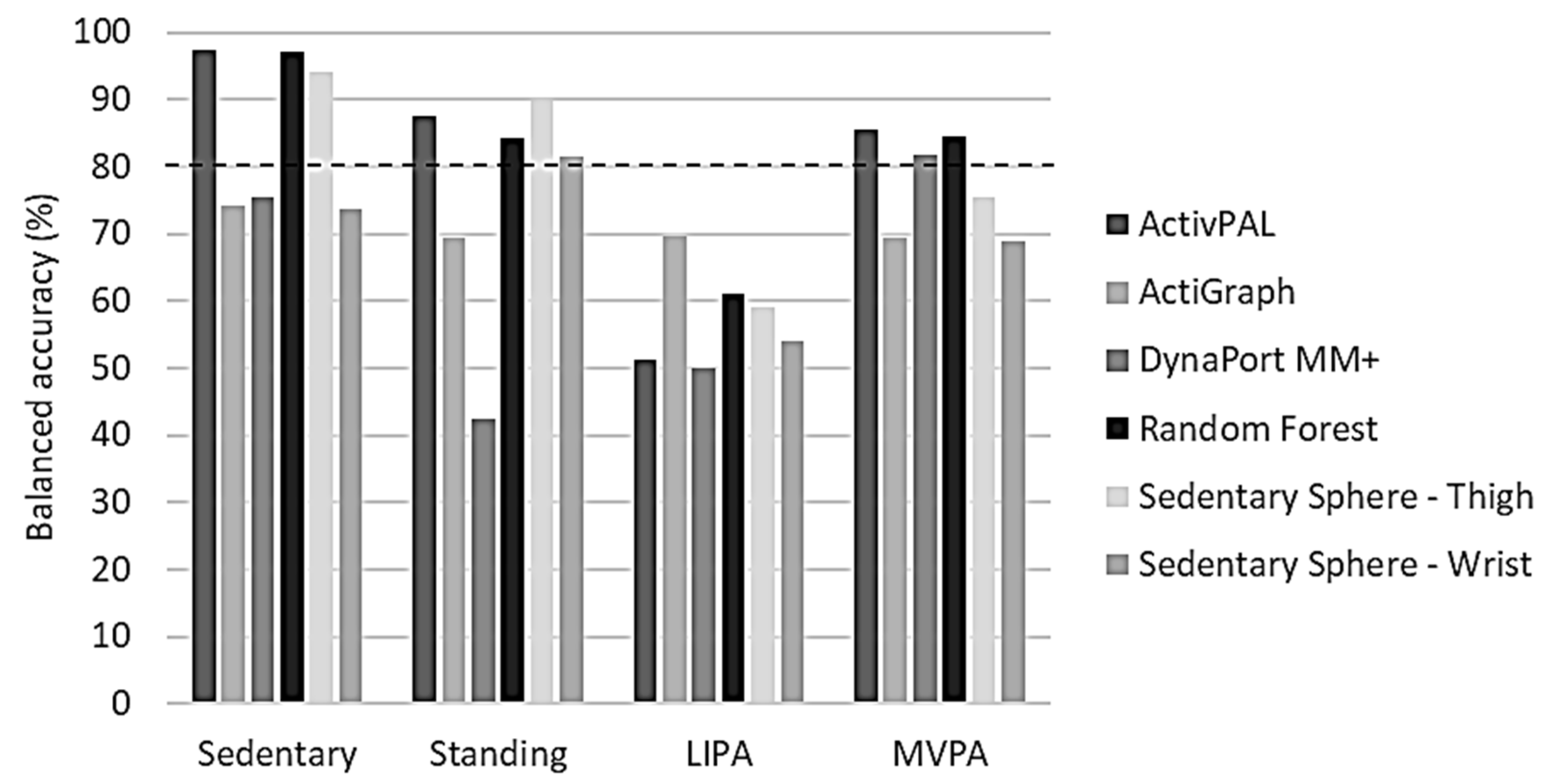 | Sedentary Sphere—Wrist | Sedentary | 381 | 17 | 111 | 104 | 67.2 | 80.1 | 73.6 | 40.0 |