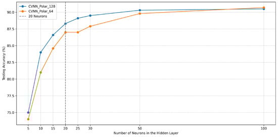 The graph in Figure 2 visualizes the testing accuracy of two CVNN models, CVNN_Polar_128 and CVNN_Polar_64, against the number of neurons in their hidden layers. The horizontal axis delineates the neuron count, ranging from 5 to 100, while the vertical axis marks the achieved testing accuracy, expressed as a percentage. A vertical dotted line at “20 Neurons” highlights the chosen neuron count, offering a visual cue for the selection. Both models demonstrate a general upward trend, suggesting that increasing the neuron count positively impacts the accuracy, up to a certain threshold.