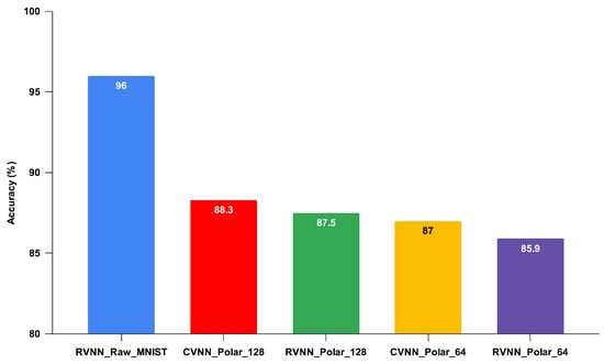 - Complex-Valued vs. Real-Valued on Polar Data: As hypothesized, the CVNN_Polar_128 model, attaining an accuracy of 88.3%, outperformed its RVNN counterpart, RVNN_Polar_128, which secured 87.5%, as shown in Figure 3. This 0.8% differential underscores the inherent advantage of CVNNs when processing polar-transformed data. The separation of real and imaginary components in RVNNs, while necessary, may lead to the omission of valuable interplay between these components, a nuance that CVNNs naturally capture.