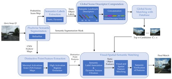 In this research, we address the shortcomings of the existing literature and propose a place recognition method that leverages semantics-based global scene information along with the local visual information, shown in Figure 1, to handle the variations in both viewpoint and appearance and achieve robustness in such extremely dynamic environments. To achieve this, we harness semantics obtained from a state-of-the-art pixel-wise semantic segmentation network [14], alongside visual information extracted using convolution neural networks (CNNs). Our proposed method executes VPR through a stepwise, hierarchical matching approach. Initially, we conduct coarse matching that utilizes global scene semantics to compute the global semantic descriptors and perform matching, which condenses the search space and provides a list of potential match candidates. Then, in the fine matching phase, we identify the distinctive local features, extracted from CNN, and perform visual–semantic and spatial matching to pinpoint the true place match among the preselected candidates. Our approach demonstrates its effectiveness by achieving a meaningful recall at 100% precision. Moreover, our rationale for adopting this approach is rooted in the potential for a semantically aided system to enhance human communication and interaction with robots and vehicles.