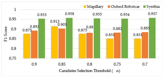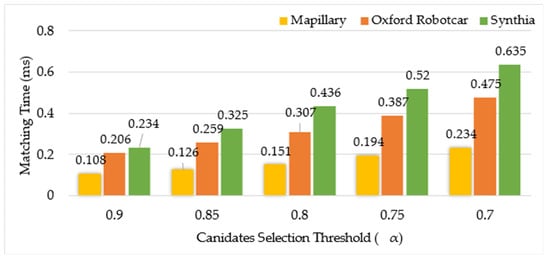 To analyze the influence of the candidates selected based on the scene similarity score on the whole method, F1-score and matching time have been adopted as the performance indicators. Note that matching time here refers to the time of local CNN feature-based place matching performed after the selection of candidates based on different values of . We select the number of candidates based on the global similarity score threshold set to 0.9, 0.85, 0.8, 0.75, and 0.7, respectively. The results of matching time and F1-Score are shown in Figure 3 and Figure 4.