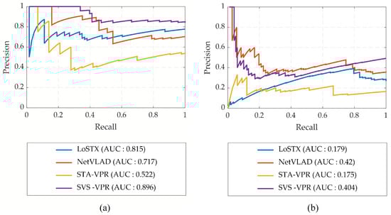 Precision–recall curves obtained for visual place recognition on Mapillary dataset: (a) Berlin A100; (b) Berlin Kudamm.