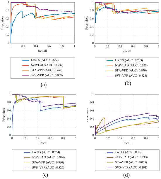 Precision–recall curves for visual place recognition using different traverses of Oxford RobotCar dataset: (a) Summer–Autumn; (b) Summer–Winter; (c) Autumn–Winter; and (d) Day–Night.
